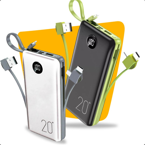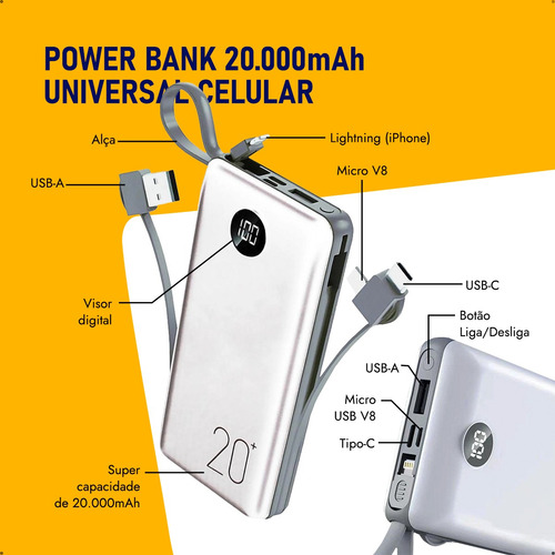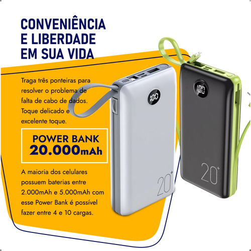 Imagine-se livre das preocupações com bateria enquanto você viaja, trabalha ou se diverte. Com uma capacidade de 20.000mAh, o Power Bank é sua fonte confiável de energia, garantindo que você nunca fique sem carga quando mais precisar. Desde smartphones e tablets até caixas de som e laptops, este carregador portátil é compatível com uma ampla gama de dispositivos, proporcionando a energia que você precisa, onde quer que esteja.